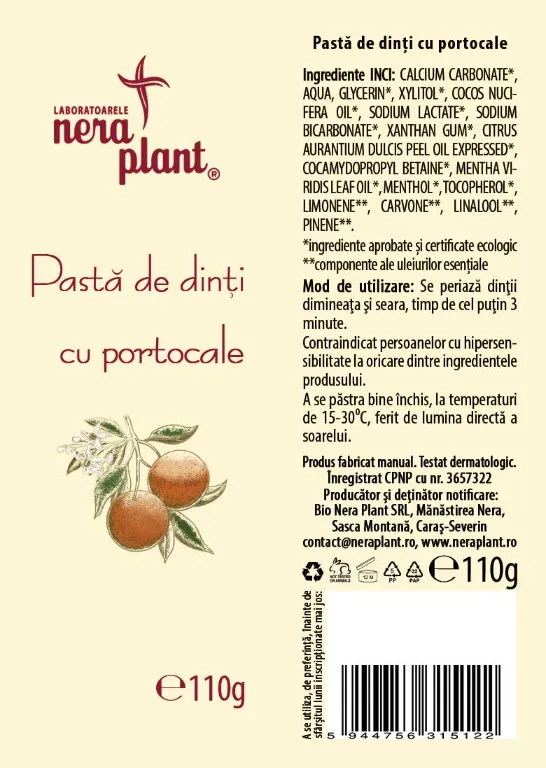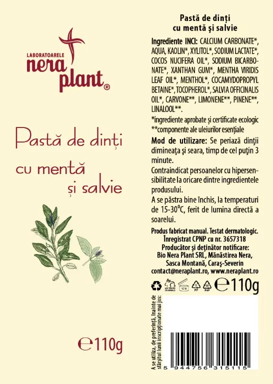Formulate exclusiv din ingrediente naturale și ecologice, cele două tipuri de Pastă de dinți Nera Plant, cu mentă și salvie și cea cu portocale sunt recomandate pentru igiena orală zilnică a întregii familii. Combinația dintre argila albă, carbonatul de calciu și uleiuri esențiale din plante favorizează o bună curățare a dințiilor, protejează gingiile, îndepărtează tartrul și împrospătează respirația. Ele nu conțin fluor și sunt indicate şi copiilor.